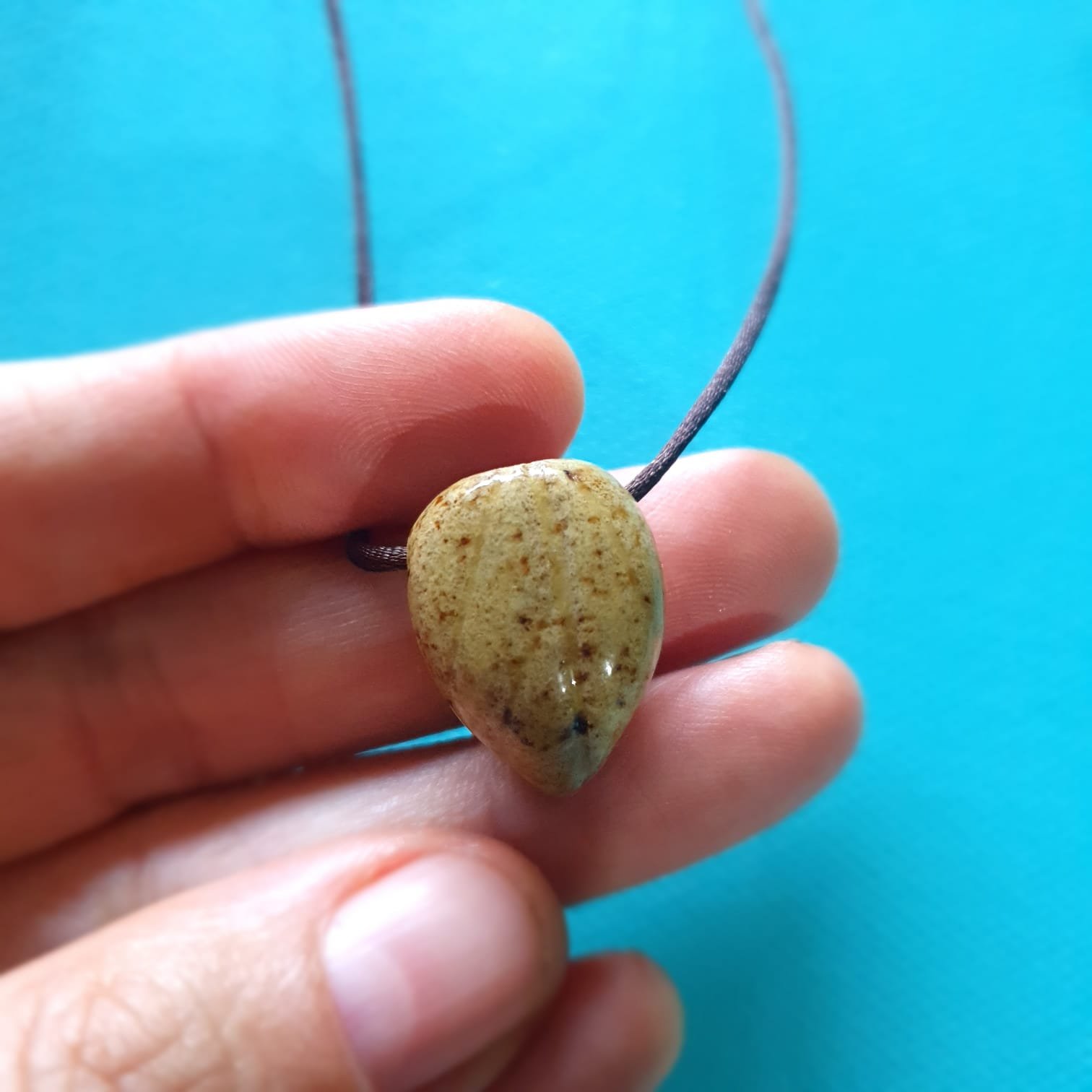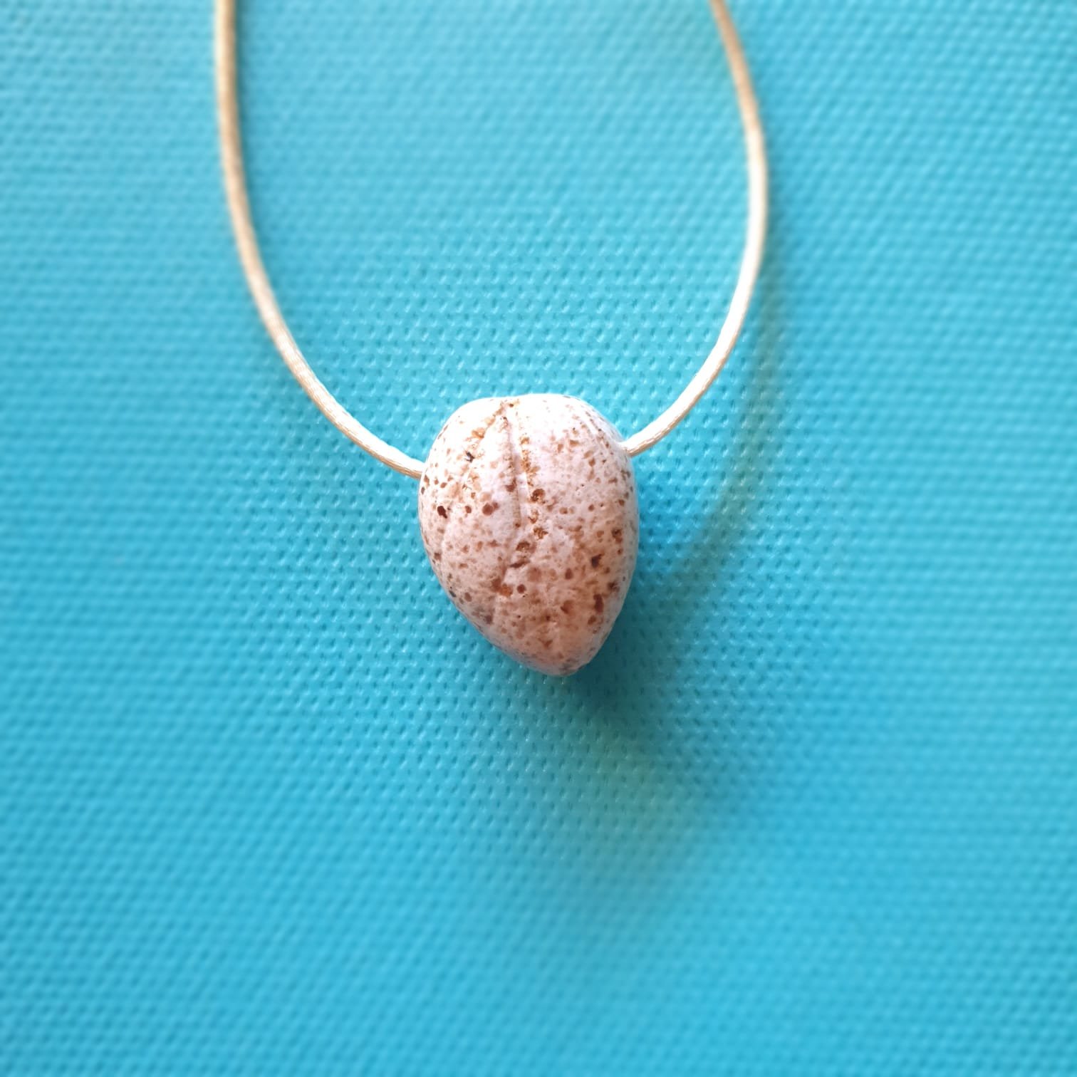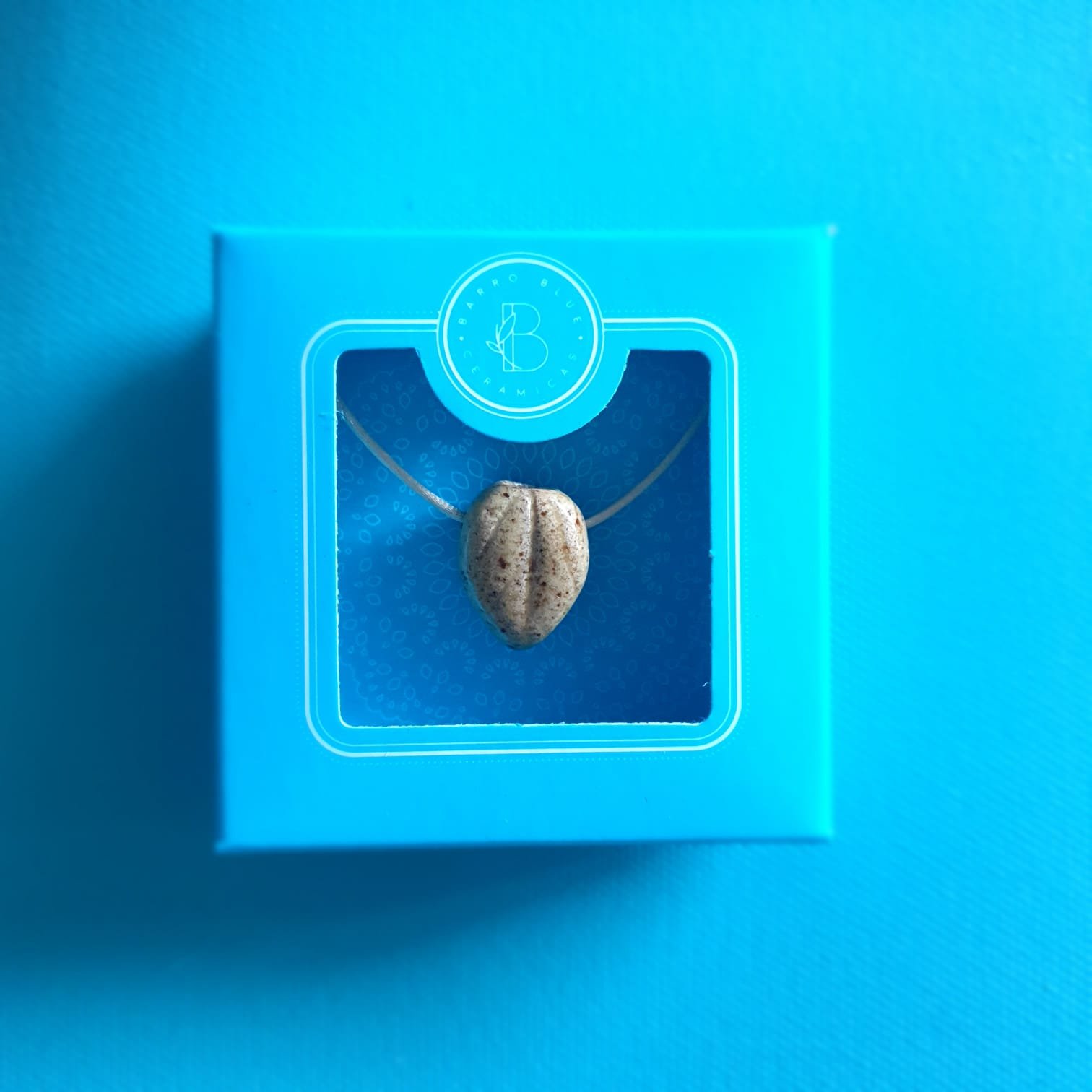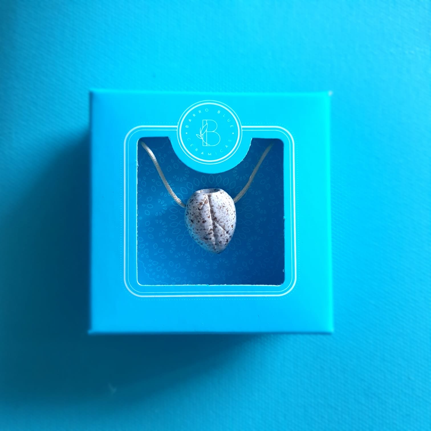 O pingente é produzido em cerâmica artesanal de alta temperatura. Esse processo garante resistência e estabilidade à peça. Além disso, a cerâmica apresenta características adequadas para uso com óleos essenciais.