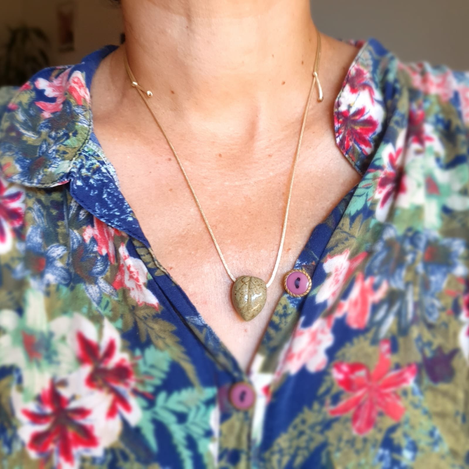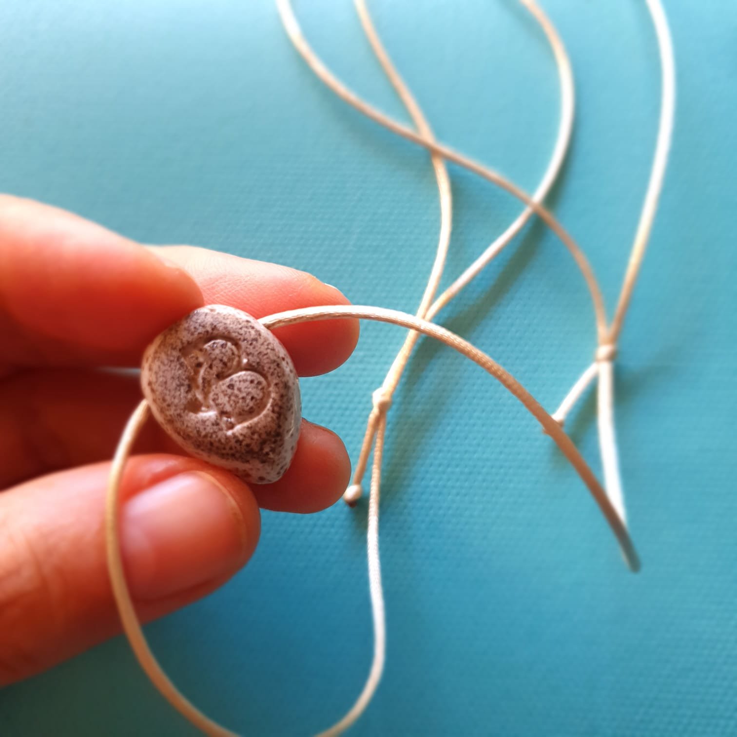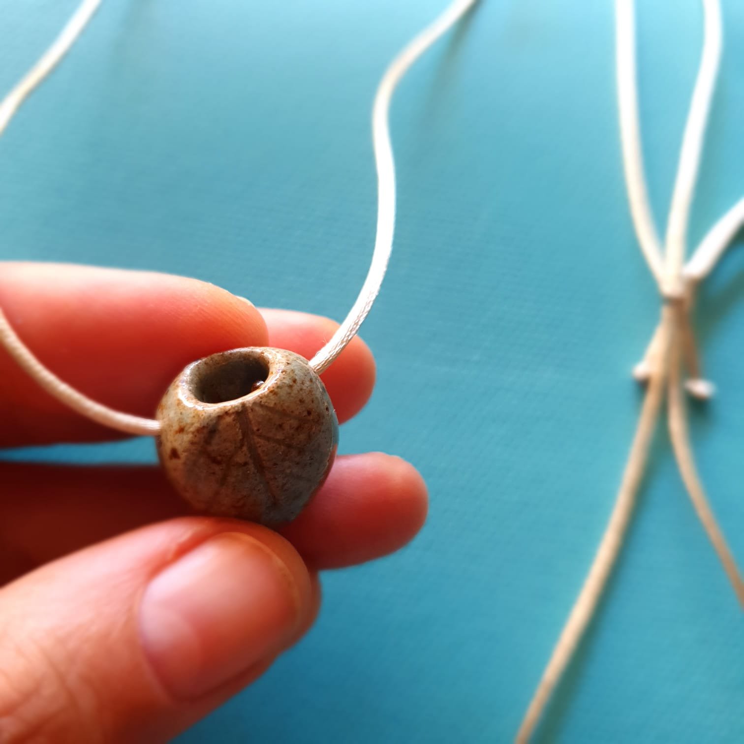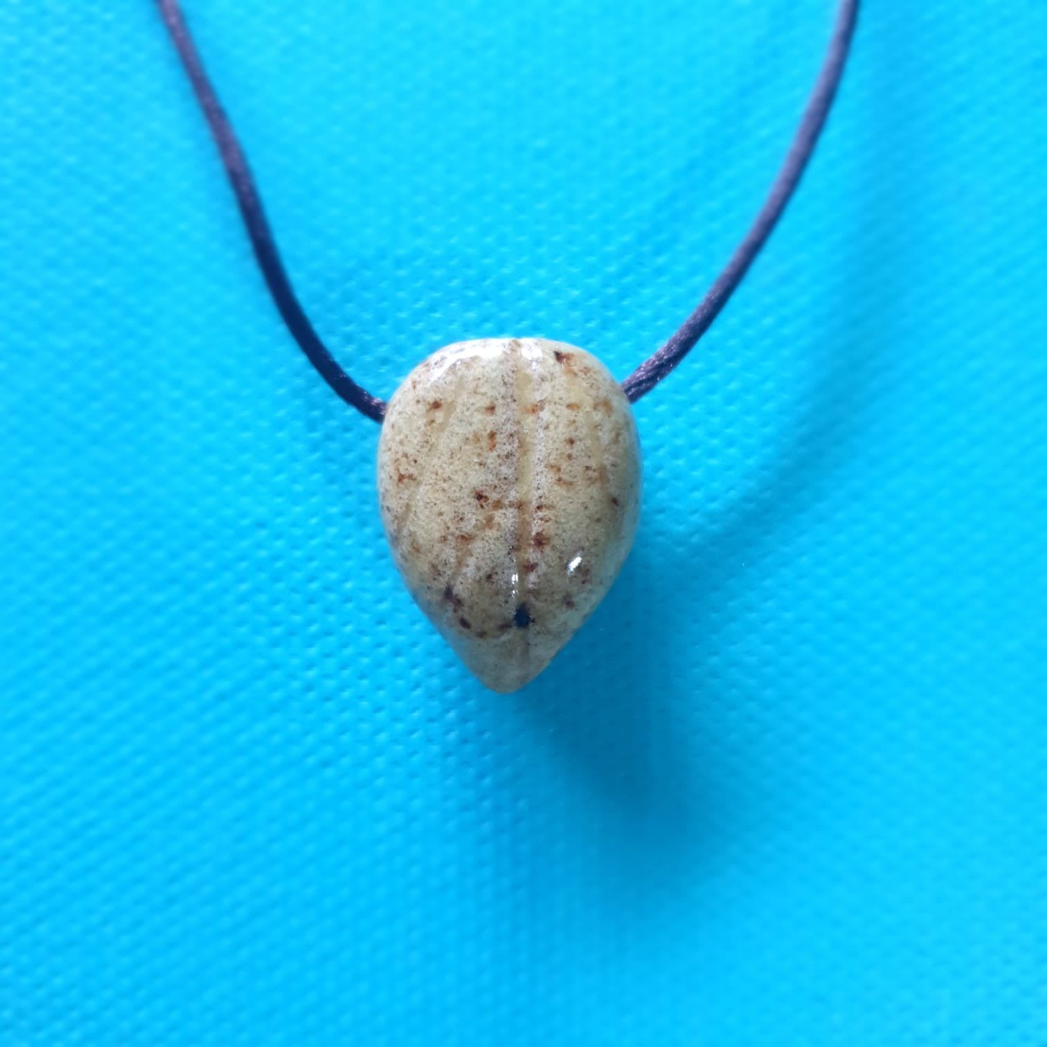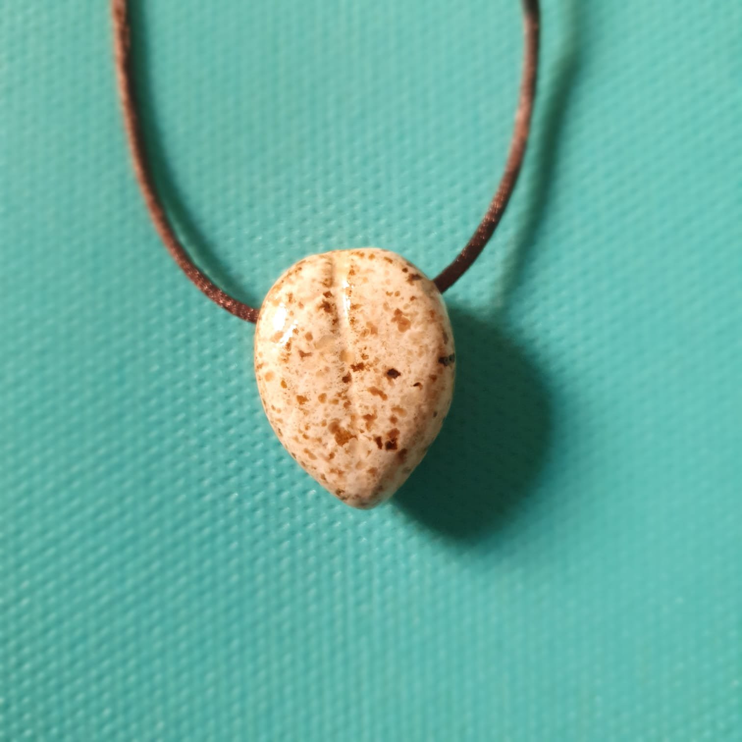 O pingente é produzido em cerâmica artesanal de alta temperatura. Esse processo garante resistência e estabilidade à peça. Além disso, a cerâmica apresenta características adequadas para uso com óleos essenciais.