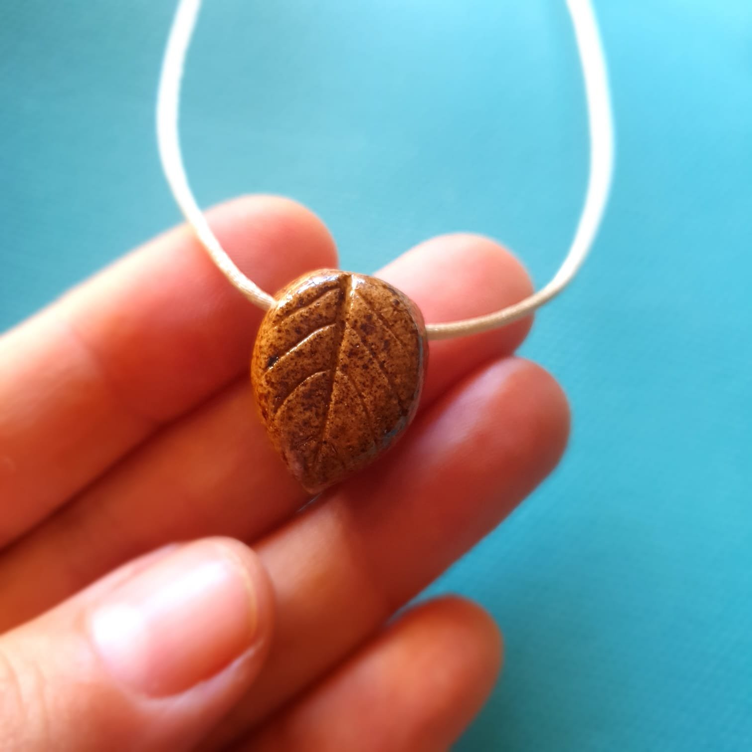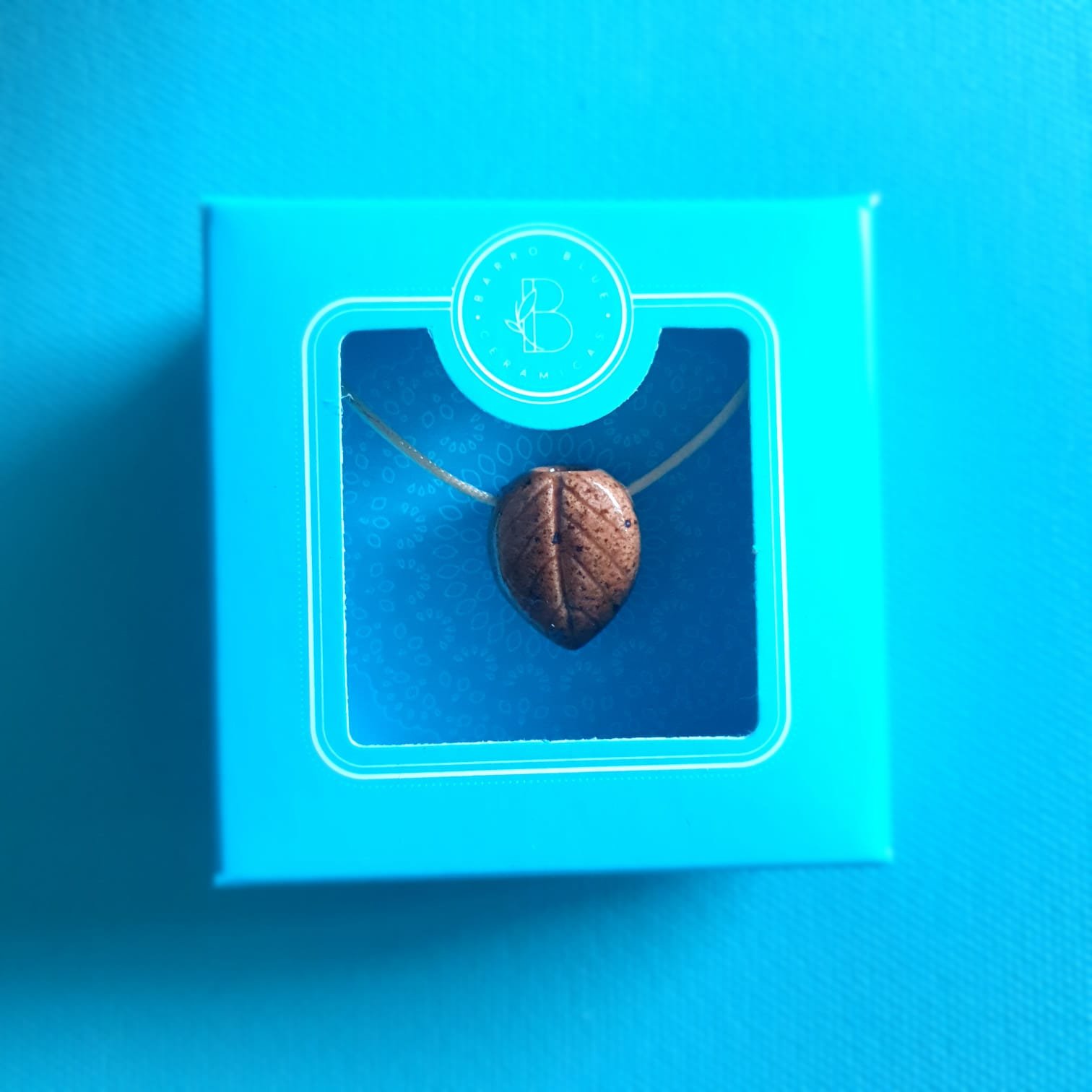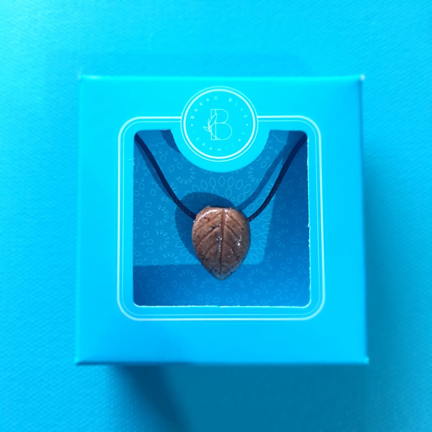 O Difusor Pessoal Folha Barro Blue é um pingente de cerâmica projetado para receber uma pequena poma de algodão embebida do óleo essencial de sua preferência. O pingente é produzido na técnica da cerâmica artesanal de alta temperatura e recebe um acabamento em cordão de cetim (100% poliéster) bege ou marrom escuro regulável.