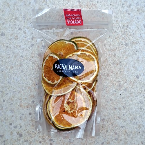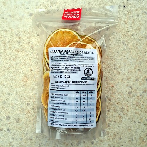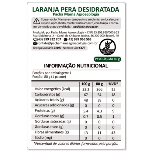 A Laranja Pera Desidratada da Pacha Mama Agroecologia é fornecida em rodelas, em embalagens de 80 gramas com fecho hermético. As frutas são fatiadas frescas, com espessura aproximada de 3 mm, e desidratadas em temperatura não superior a 46 °C, em fluxo de ar contínuo, sem adição de açúcar, conservantes ou qualquer outro aditivo.